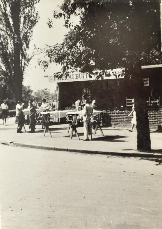 Leírás: 1954 Büfé a Margitszigeten, hátoldalon feliratozott és dátumozott fotó, 11,5×8,5 cm