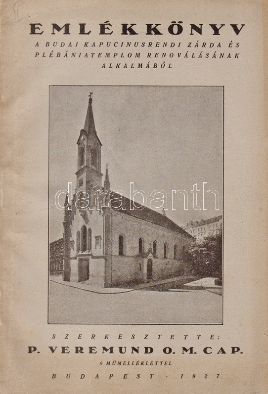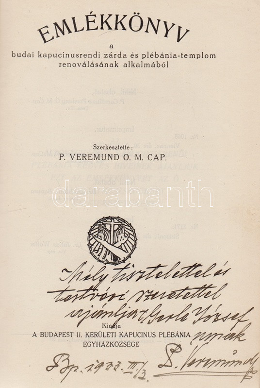Dedikált: ,,Mély tisztelettel és testvéri szeretettel ajánlja t. Gerle József úrnak P. Veremundus. Bp. 1933. III/3." A Budán 1686-ban letelepedő kapucinus rendi zárda és plébániatemplom története, oldalszámozáson belül néhány szövegközti illusztrációval. A plébániatemplom jelenleg is a rend tulajdonában működik, az I. kerület Fő utca 32. szám alatt.
