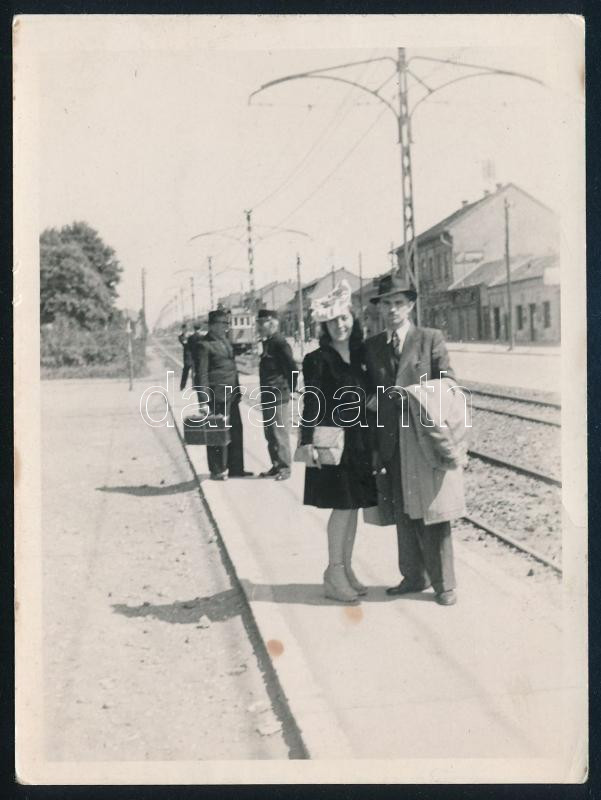 Leírás: cca 1940 Pesterzsébet, villamosmegálló, fotó, 12x9 cm