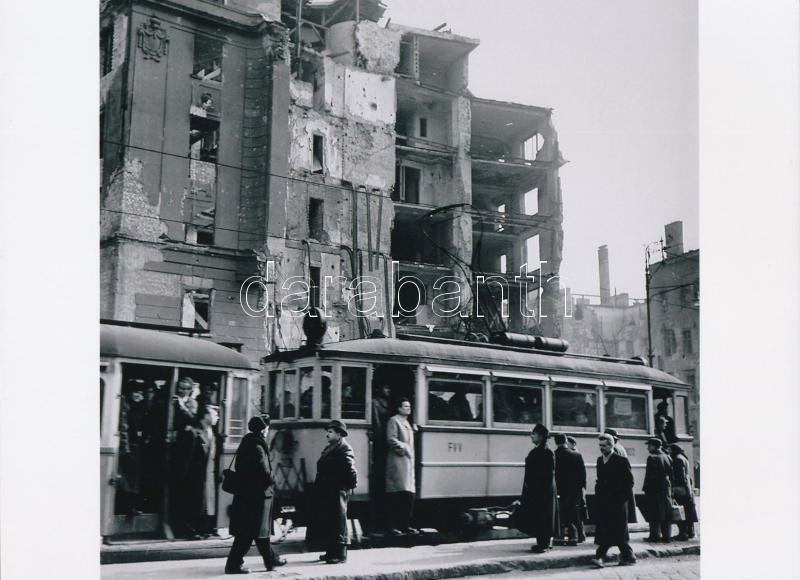Leírás: cca 1956 november, Budapesten a 4-es villamos vonalán, 1 db modern nagyítás, jelzés nélkül, 15x21 cm