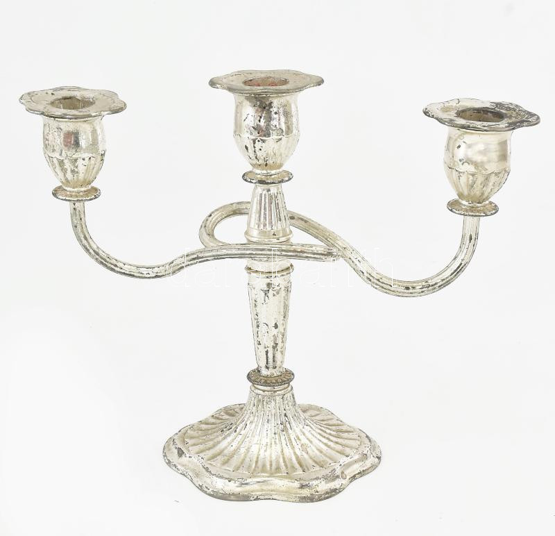 Leírás: Háromágú gyertyatartó. Ezüstözött, kopással, 23x27 cm