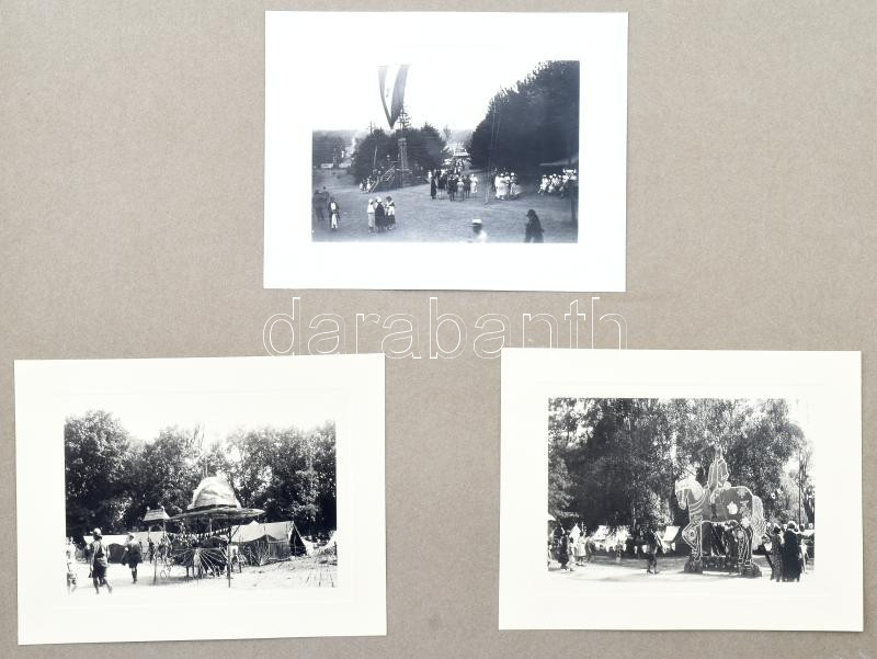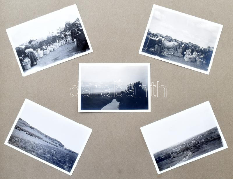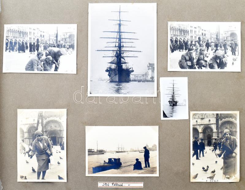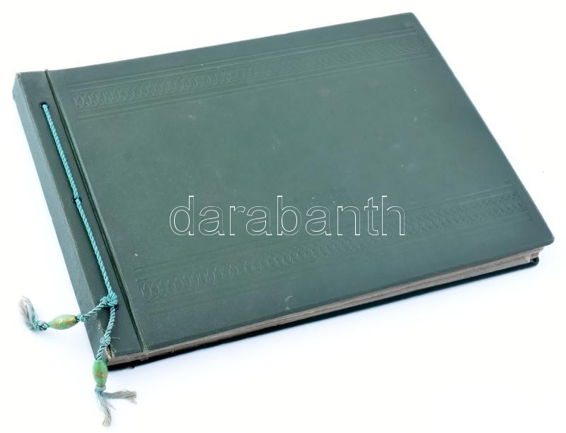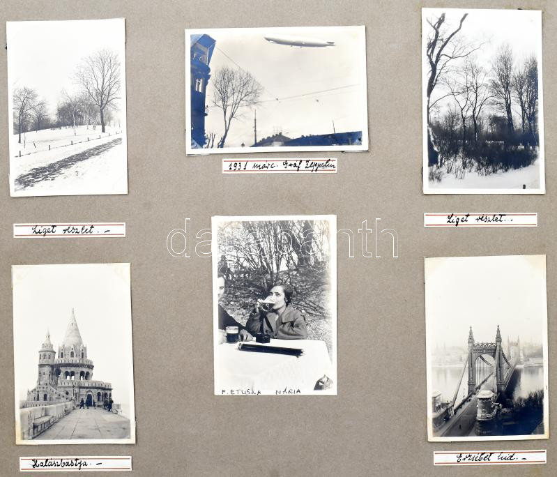 cca 1930-1940 Családi fotóalbum (Fenyődi család), benne érdekes képekkel: Graf Zeppelin léghajó Budapest felett, Halászbástya, Parlament, utazási képek (Velence, Fiume), mezőgazdasági munka, tájképek (Erdély?), cserkésztábor, néhány katonafotó, stb. Összesen több, mint 100 db fotóval. Zsinórfűzéses, vászonborítású albumban, 25x35 cm
