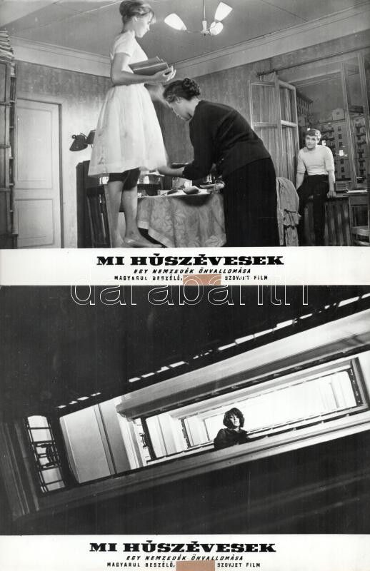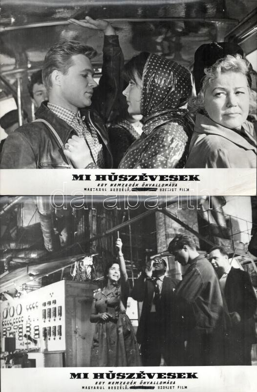 cca 1989 előtti ,,Mi húszévesek" című szovjet film jelenetei és szereplői, 13 db vintage produkciós filmfotó (vitrinfotó, lobbyfotó) ezüst zselatinos fotópapíron, a használatból eredő (esetleges) kisebb hibákkal, 18x24 cm
