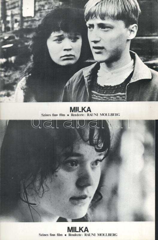 cca 1989 előtti ,,Milka" című finn film jelenetei és szereplői, 2 db produkciós filmfotó (vitrinfotó, lobbyfotó) nyomdatechnikával sokszorosítva kartonpapírra, egyoldalas nyomással, a használatból eredő (esetleges) kisebb hibákkal, 18x24 cm