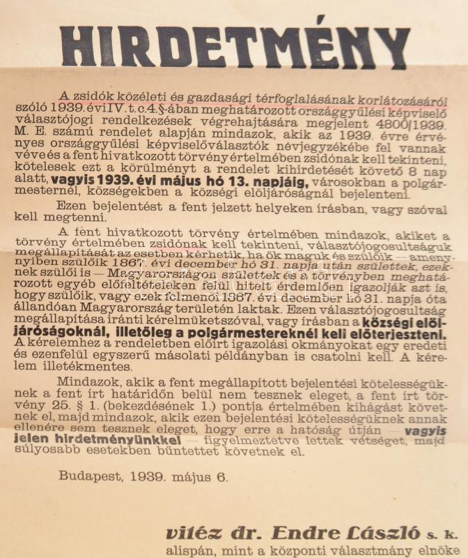19939 Zsidók közéleti és gazdasági térfoglalásának korlátozásól szóló törvény (Első zsidótörvény) alapján zsidónak minősülő személyek bejelentéséről szóló hirdetmény Endre László nevében. 32x37 cm
