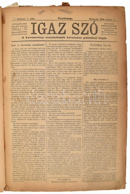 1908 Az Igaz szó c. keresztény szocialista politikai lap V. évfolyama ... https://www.darabanth.com/hu/466-Gyorsarveres/466.0/Mutargy-papirregiseg-egyeb/Nyomtatvanyok~500013/1908-Az-Igaz-szo-c-kereszteny-szocialista-politikai-lap-V-evfolyama-bekotve-Lapok-jo-allapo~II3147360