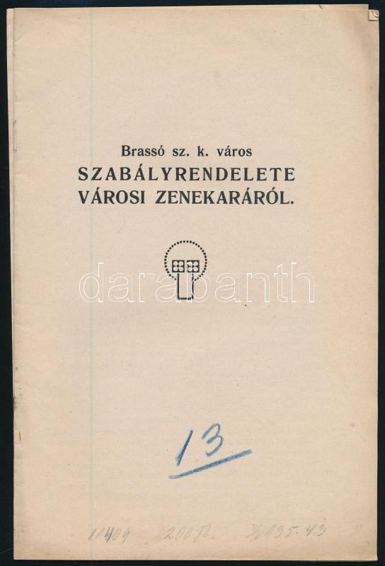 1914 Brassó, Brassó sz. k. város szabályrendelete városi zenekaráról, ... https://www.darabanth.com/hu/466-Gyorsarveres/466.0/Mutargy-papirregiseg-egyeb/Nyomtatvanyok~500013/1914-Brasso-Brasso-sz-k-varos-szabalyrendelete-varosi-zenekararol-utolso-lap-levalt-17~II3144736