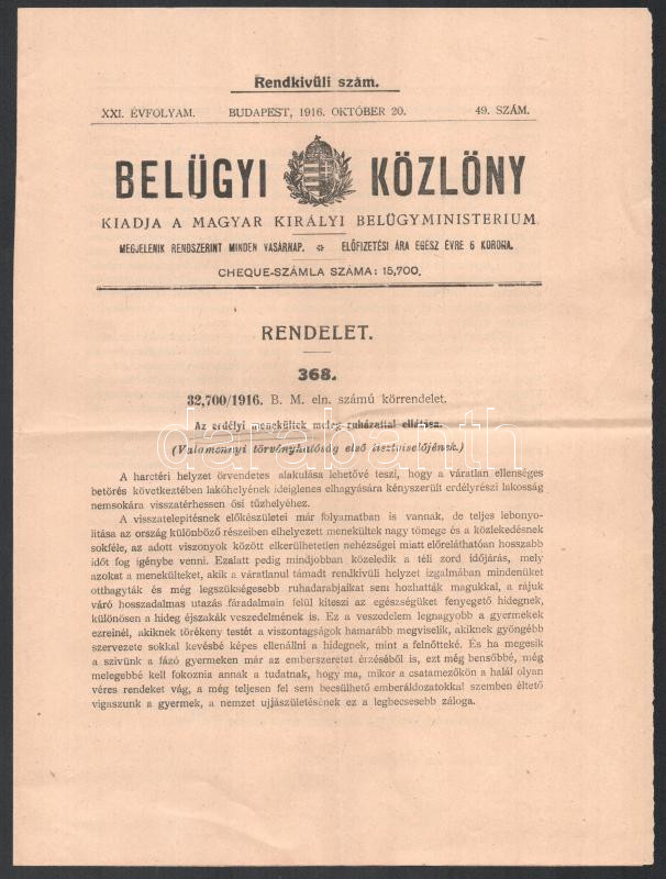 Leírás: 1916 Belügyi közlöny a román betörés miatti erdélyi menekültek ruhával való ellátása tárgyában született rendelettel 4 p.