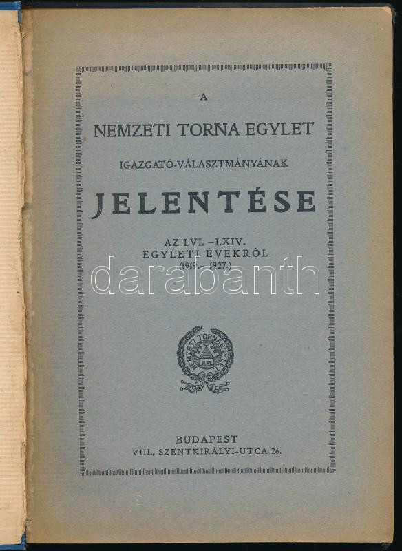 1928 A Nemzeti Torna Egylet igazgató-választmányának jelentése az LVI.-LXIV. egyleti évekről (1919.-1927.) Bp., "Hangya"-ny., 172+(4) p. Szövegközti fekete-fehér képekkel és színes képtáblákkal illusztrálva. Aranyozott egészvászon-kötésben, kissé foltos borítóval, az elülső és hátsó papírborítók bekötve.
