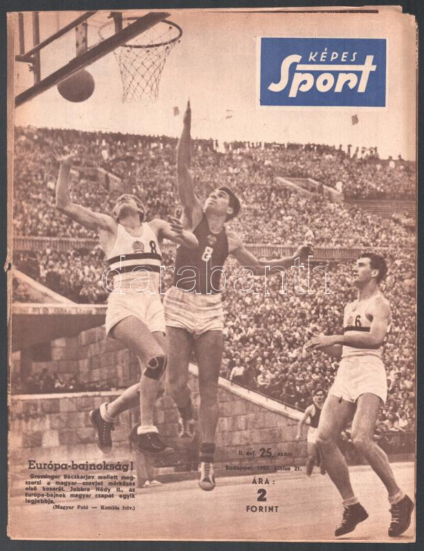 1955 Képes Sport II. évf. 25. sz., 1955. jún. 21. A címlapon a IX. Kosárlabda EB Magyarország-Szovjetunió mérkőzése (Greminger János kosarat szerez). Tűzés nélkül, 16 p.