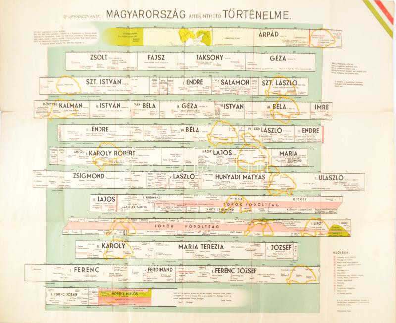 cca 1941 Dr. Urmánczy Antal: Magyarország áttekinthető történelme, grafikus időrendi táblázat, Bp., Klösz-ny., hajtva, kisebb szakadásokkal, 85,5x65,5 cm