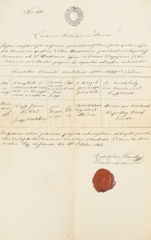 Leírás: 1847 halotti bizonyítvány a brezoviczai temetőben eltemetett személyről, egy kézzel írt oldal, latin és magyar nyelven, viaszpecséttel