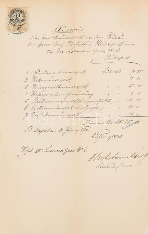 Leírás: 1890 Bp. VII. Losonci utca, számla háztulajdonos részére