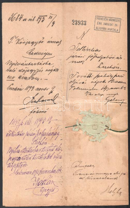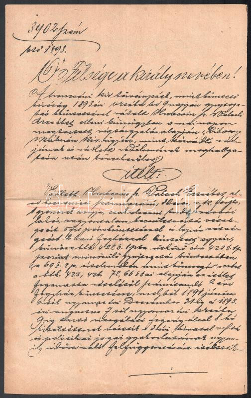 Leírás: 1893 A trencséni törvényszék ítélete gyújtogatással vádolt nő ellen
