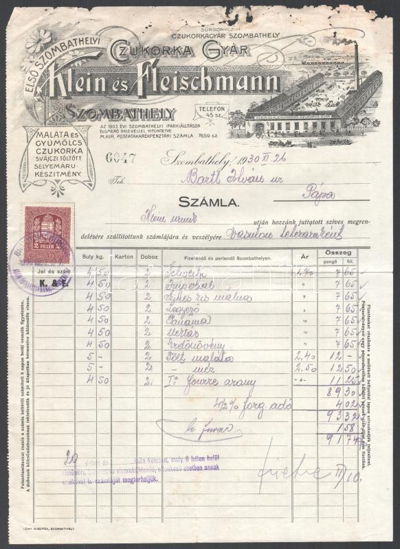 1930 Klein és Fleischmann Első Szombathelyi Cukorka Gyár dekoratív fejléces számla Imperial, Legyező, Panama, Nektár, Töltött maláta, töltött mézcukor Ia fourre arany cukor tárgyában, kézzel írott, sérült