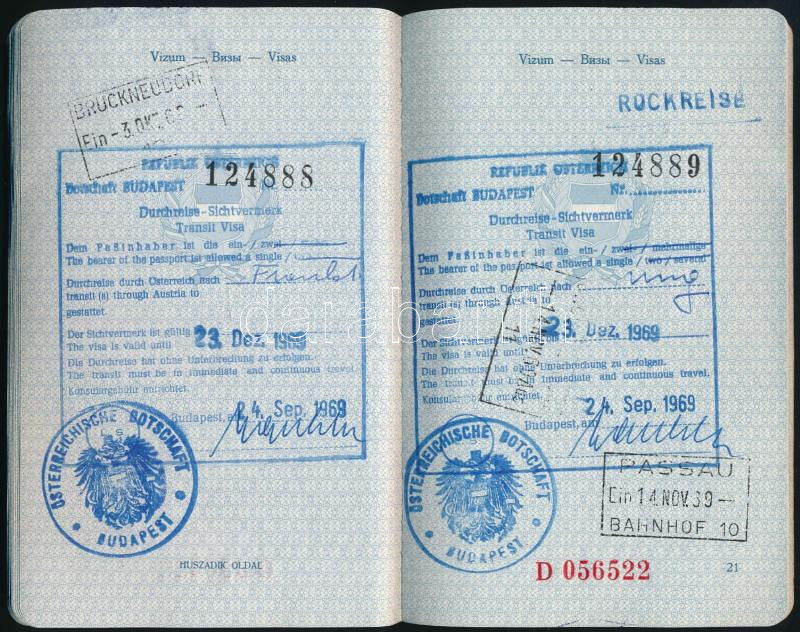 Leírás: 1969 Magyar Népköztársaság, fényképes kék útlevél, belga, francia, osztrák vízumokkal
