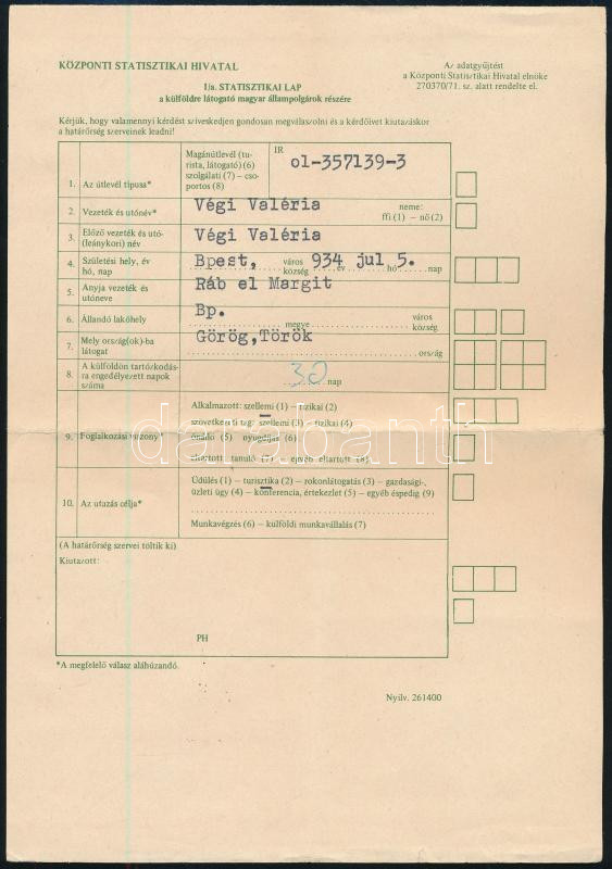 Leírás: 1972 Magyar Népköztársaság által kiállított útlevél, svéd, svájci, spanyol stb. vízumokkal + statisztikai lap
