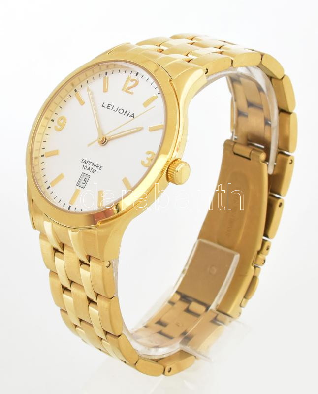 Leírás: Leijona Sapphire dátumkijelzős elegáns férfi karóra, díszdobozban. Működik, kvarc, karcmentes, aranyozott fém szíjjal, d: 35 mm