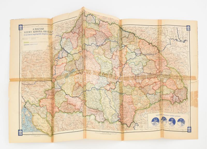 1920 A Magyar Szent Korona Országai és az entente megállapította ideiglenes határvonal. Nagy-Magyarország térkép, irredenta "Nem, Nem, Soha" feliratokkal, a nemzetiségi arányokat szemléltető grafikonokkal. 1 : 1.500.000. Bp., Magyar Földrajz Intézet Rt., sérült, javított, a borító hiányzik, 71x44 cm