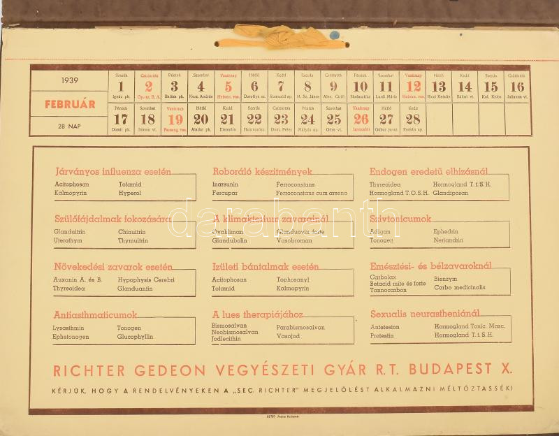 1939 A Richter Gedeon gyógyszergyár naptára termékek reklámjával, egy ... https://www.darabanth.com/hu/466-Gyorsarveres/466.0/Mutargy-papirregiseg-egyeb/Reklam~500053/1939-A-Richter-Gedeon-gyogyszergyar-naptara-termekek-reklamjaval-egy-lap-januar-hianyzik-~II3144235
