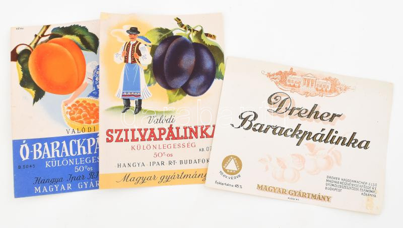 Leírás: 3 db régi magyar italcímke: Dreher Barackpálinka, ill. Hangya Ipar R.T. Ó-barackpálinka és Szilvapálinka, 14x10 cm körül