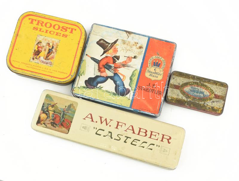 Leírás: 4 darab reklám fémdoboz: A.W. Faber, First Class Ship Soda, Troost Slices, J.S. Staedtler, klf méretben, állapotban