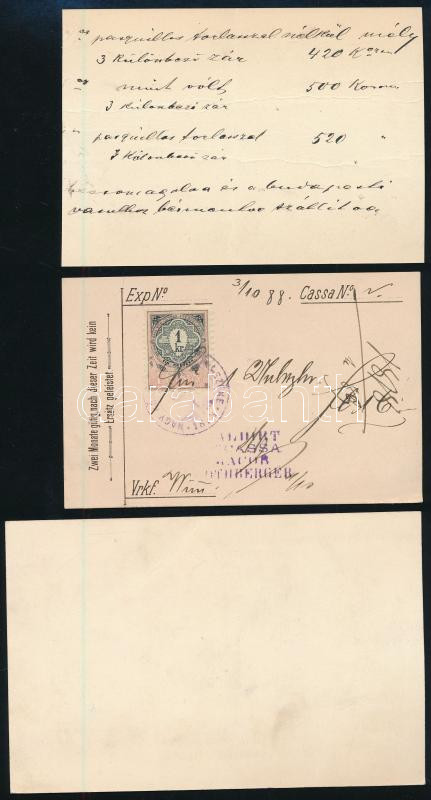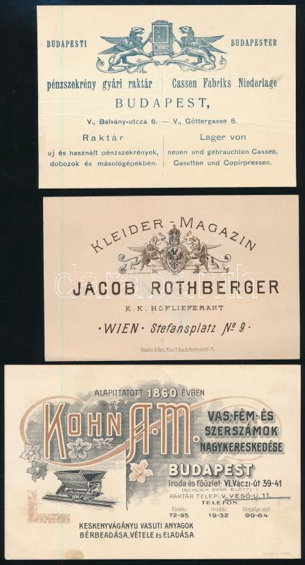 Leírás: cca 1880-1890 3 db reklám kártya, számla, Kohn vas- és fém szerszámok, Rothberger ruha, Budapesti pénzszekrény gyár