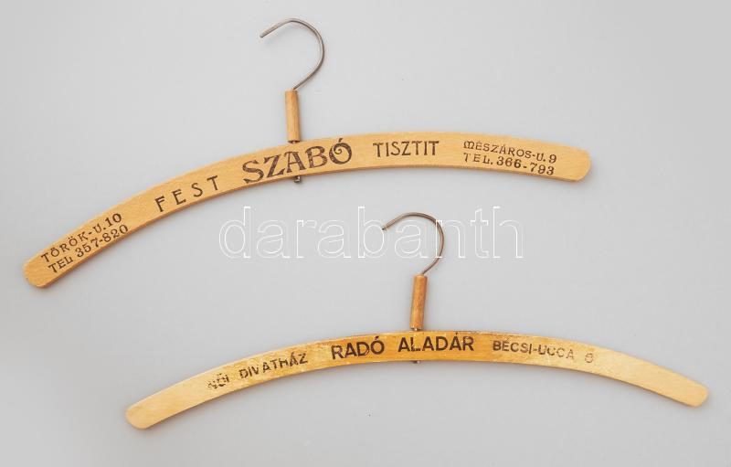 Leírás: cca 1930-40 2 db reklámos budapesti vállfa, Radó Aladár Bécsi ucca 6 és Szabó tisztító Török u. 10/Mészáros u. 9.