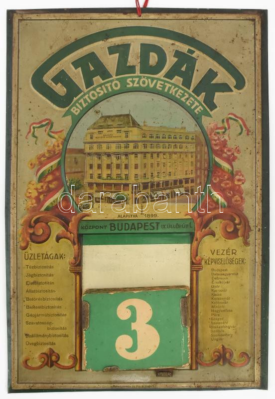 cca 1930 Gazdák biztosító szövetkezete. Nagy méretű festett fém tábla,... https://www.darabanth.com/hu/466-Gyorsarveres/466.0/Mutargy-papirregiseg-egyeb/Reklam~500053/cca-1930-Gazdak-biztosito-szovetkezete-Nagy-meretu-festett-fem-tabla-fali-naptar-jo~II3148831