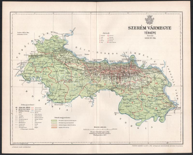 Leírás: 1897 Szerém vármegye térképe, tervezte: Gönczy Pál, 1 : 680.000, Bp., Posner Károly Lajos és Fia, a Pallas Nagy Lexikona melléklete, 23,5x29 cm