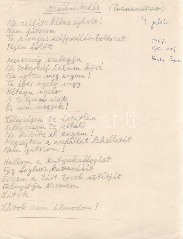 Weöres Sándor (1913-1989) költő, író Vasko Popa (1922-1991) román származású szerb költő ,,Megismerkedés" című abszurd költeménye műfordításának saját kézzel, ceruzával írt kézirata. Kelt: [Budapest, 1967]. Egy levél, mérete: 272x210 mm, egy beírt oldal. Költemény-műfordításunk Vasko Popa: Ostromlott derű (Európa Könyvkiadó, 1968.) című verseskötetének 9-10. oldalán, az azonos című, hét abszurd költeményből álló, egyszerre népi és szürreális hatásokat mutató ciklus nyitóverseként jelent meg nyomtatásban. A kézirat szövege megegyezik a nyomtatásban megjelenttel. Vasko Popa a legtöbbet fordított szerb költő: 22 idegen nyelven 54 önálló kötete jelent meg. A kézirat jobb felső sarkában feltehetően Belia György szerkesztő autográf megjegyzése: ,,4 pld. 1967. ápr.-máj. Vasko Popa''. A magyar cím mellett az eredeti szerb cím (Poznanstvo) zárójelbe téve és zöld tintával áthúzva. Kifogástalan, jó állapotú lap.