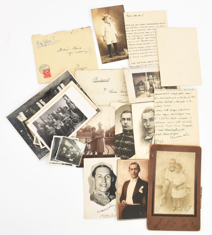 cca 1910-1940 Vegyes papírrégiség tétel, közte Nagy Gábor és Molnár Mária színészek levelezése, aláírt fotók, ill. katonafotók, egyenruhás igazolványkép, stb.