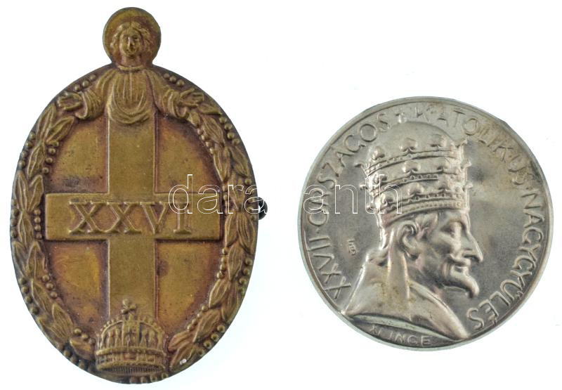 1935. "XXVI. Országos Katolikus Nagygyűlés" Cu lemezjelvény (41x28mm) + Pankotai Farkas Béla (1885-1945) 1936. "XXVII. Országos Katolikus Nagygyűlés - XI. Ince" ezüstözött Cu lemezjelvény (28mm) T:AU patina
