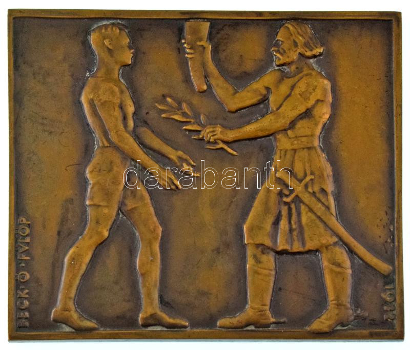 Leírás: Beck Ötvös Fülöp (1873-1945) 1932. "Balatoni Versenyek - Országos Testnevelési Tanács" bronz sport emlékplakett (61x70mm) T:AU kis patina