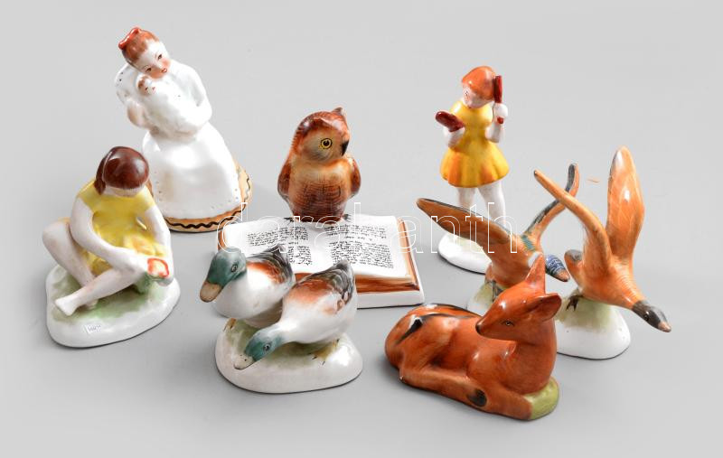 Leírás: 7 darab Bodrogkeresztúri mázas kerámia figura, közte ritka babázó lány figurával. Kis kopással.