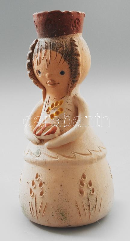 Leírás: Kerámia lányalakos gyertyatartó. Jelzés nélkül, kis kopással, m: 18 cm