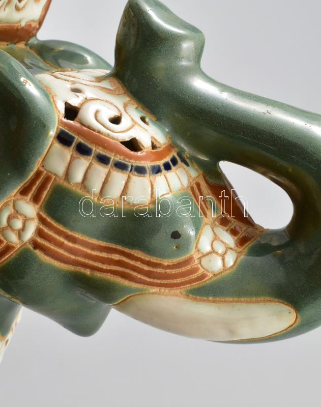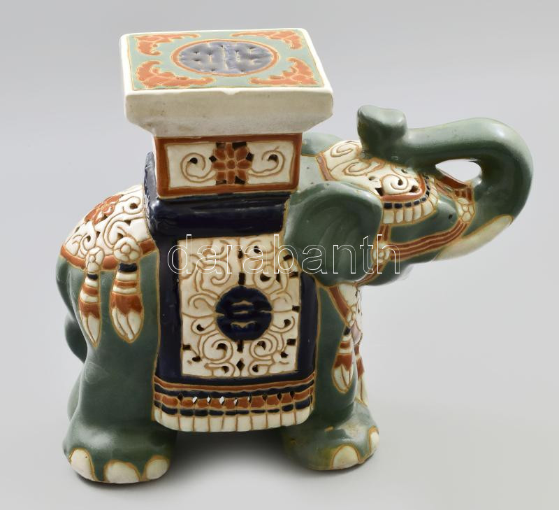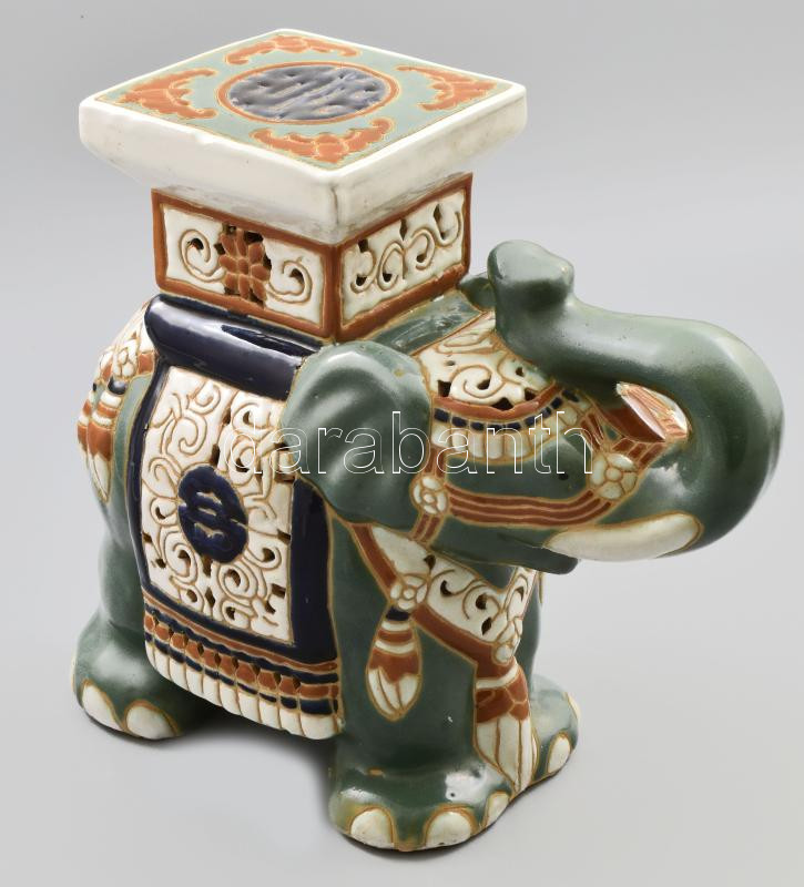 Leírás: Mázas kerámia elefánt posztamens, jelzés nélkül, hibátlan, 35x15x29 cm, tartófelülete 12x13 cm