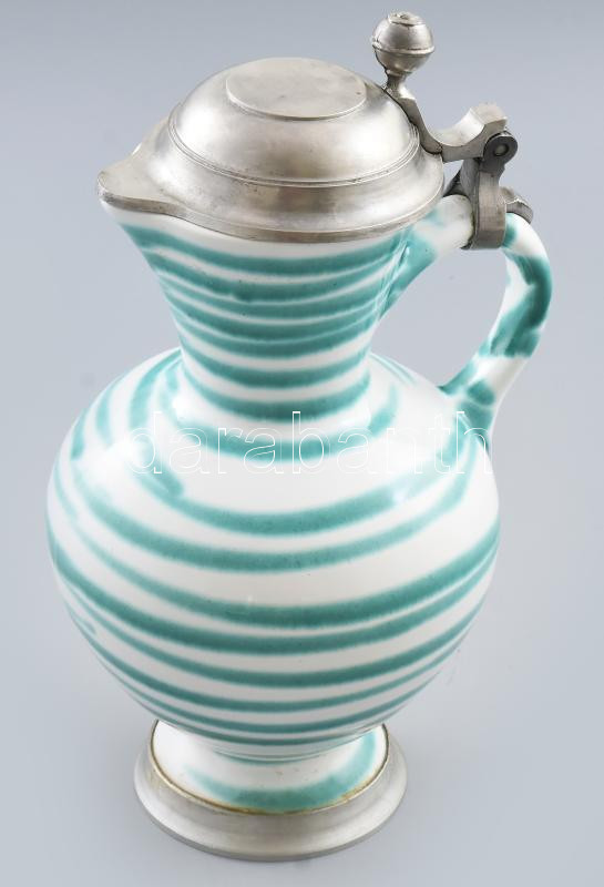 Leírás: Ón fedeles kancsó, csíkos zöld mázzal. Jelzett, hibátlan 26 cm