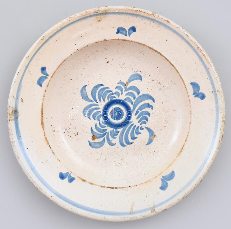 Leírás: Tál. Felvidék, cca 19. sz. második fele, kopással, akasztójánál sérült, d: 23 cm
