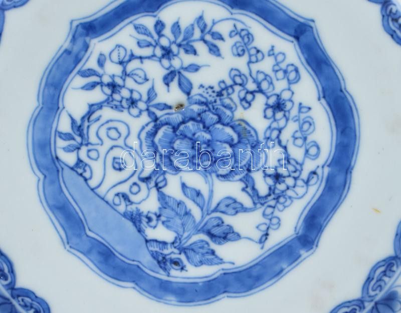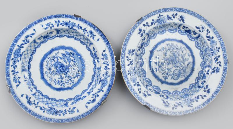 2 db kínai fali dísztányér XIX.sz.. Kézzel festett, jelzés nélkül, repedésekkel. 23 cm / Chinese porcelain plate. Hand painted, without mark with cracks