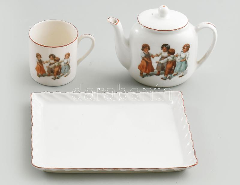 Leírás: 3 darabos antik játékporcelán készlet, sérülésekkel, 16x12 cm