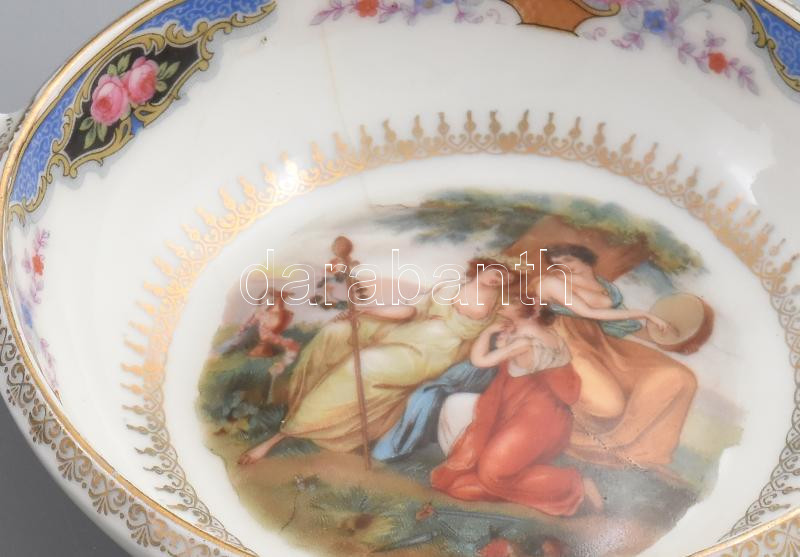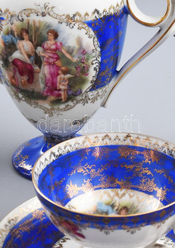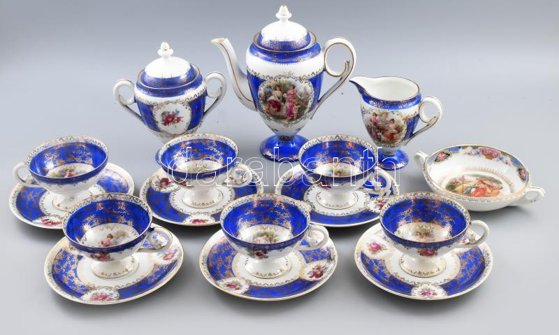 Leírás: Cseh Alt-Wien porcelán teás készlet, antik dekorral. Matricás, jelzett, kis kopással Hat személyes, teljes + hozzá egy kínáló tálka