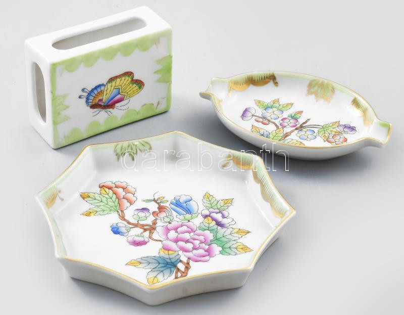 Leírás: Herendi Viktória mintás dohányzó szett: hamuzó, tálka, gyufatartó. Jelzett, hibátlan.