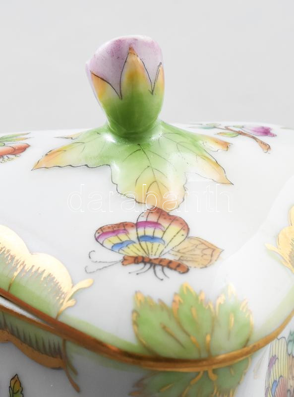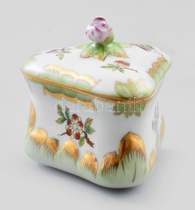 Leírás: Herendi Viktória mintás fedeles ékszeres doboz, nyíló rózsa fogóval. Jelzett, hibátlan, 7x7,5x8 cm
