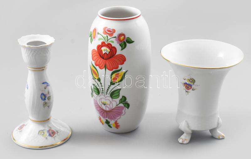 Leírás: Hollóházi 3 darab tárgy: váza, gyertyatartó. Jelzett, hibátlan, m: 12-17 cm
