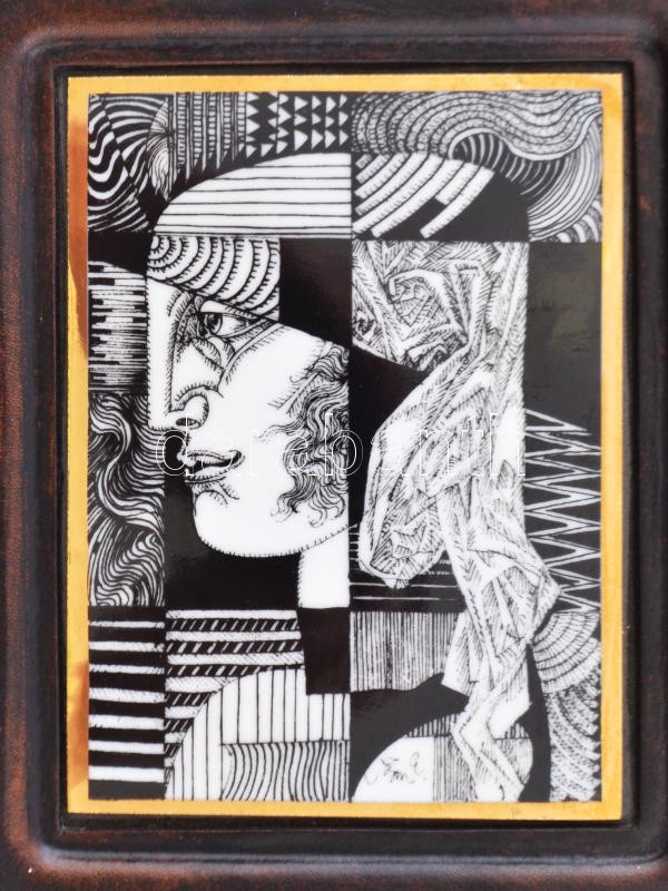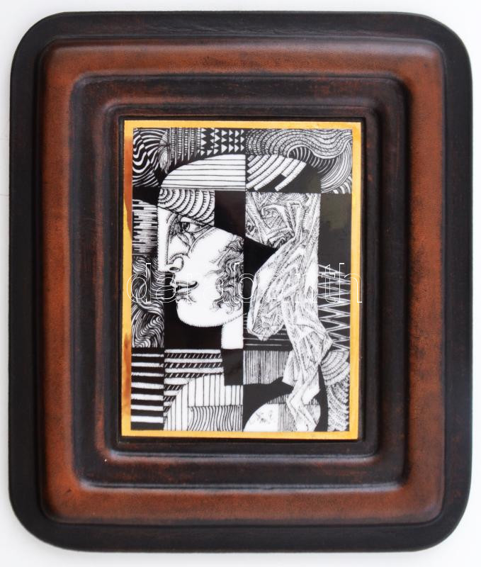 Leírás: Hollóházi Szász Endre által tervezett mintával díszített porcelán falikép, bőr keretben 10x12 cm, 18x21 cm