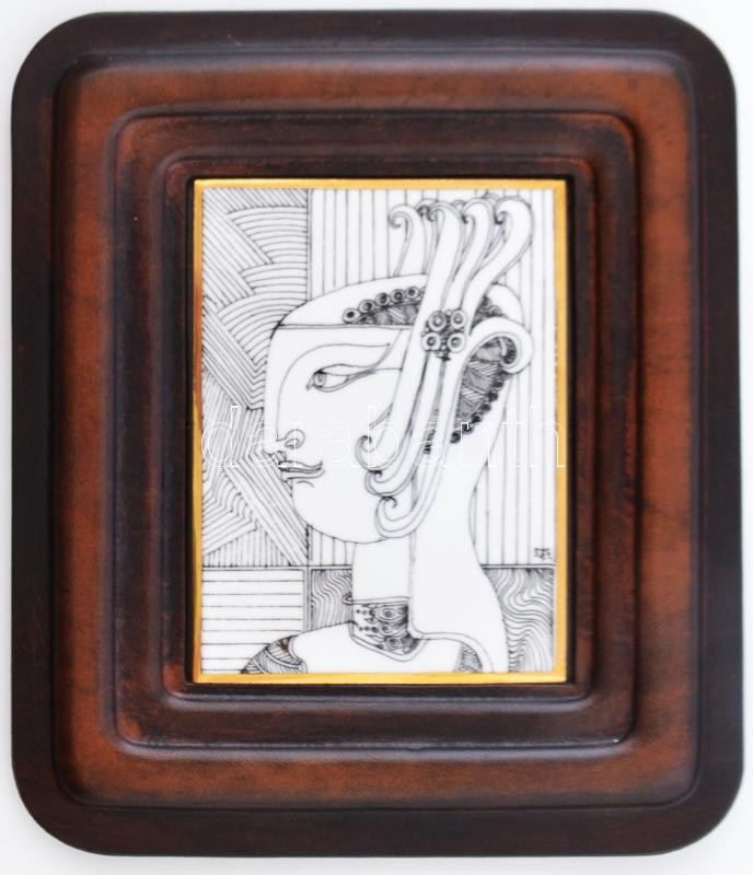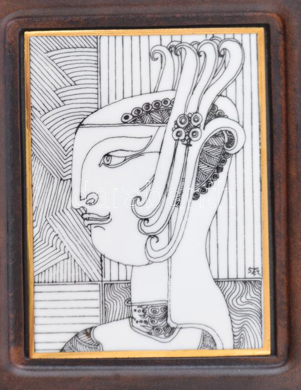 Leírás: Hollóházi Szász Endre által tervezett mintával díszített porcelán falikép, bőr keretben 9x12 cm, 18x21 cm