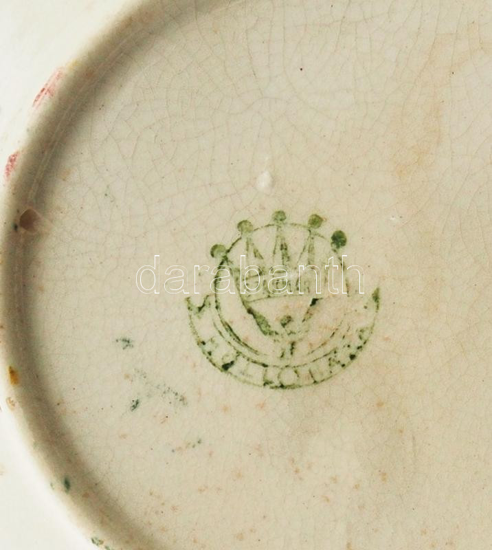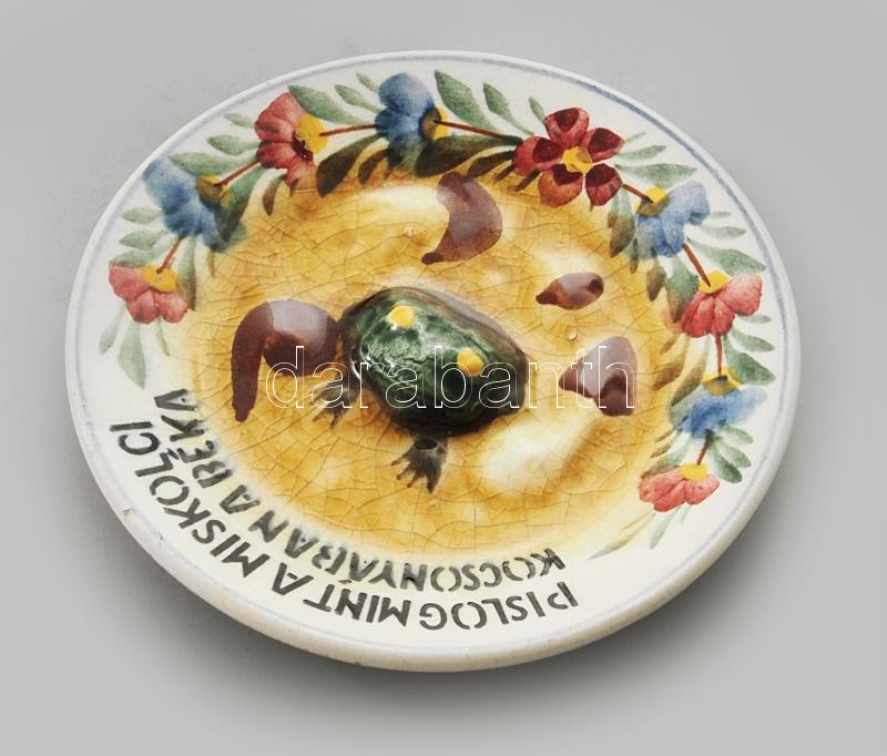 Hollóházi antik humoros tálka "Pislog mint a miskolci kocsonyában a béka" felirattal béka plasztikus díszítéssel, kézzel festett, jelzett, kis kopottsággal, d: 14,5 cm