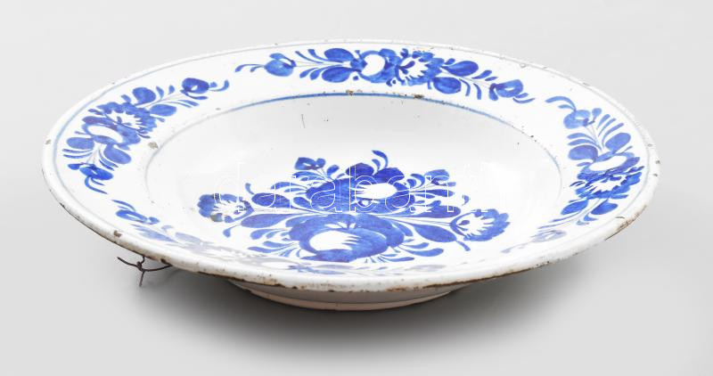 Leírás: Hollóházi kékvirágos tányér. cca 19. sz második fele, jelzett, kopással, kis repedésvonallal, d: 22 cm