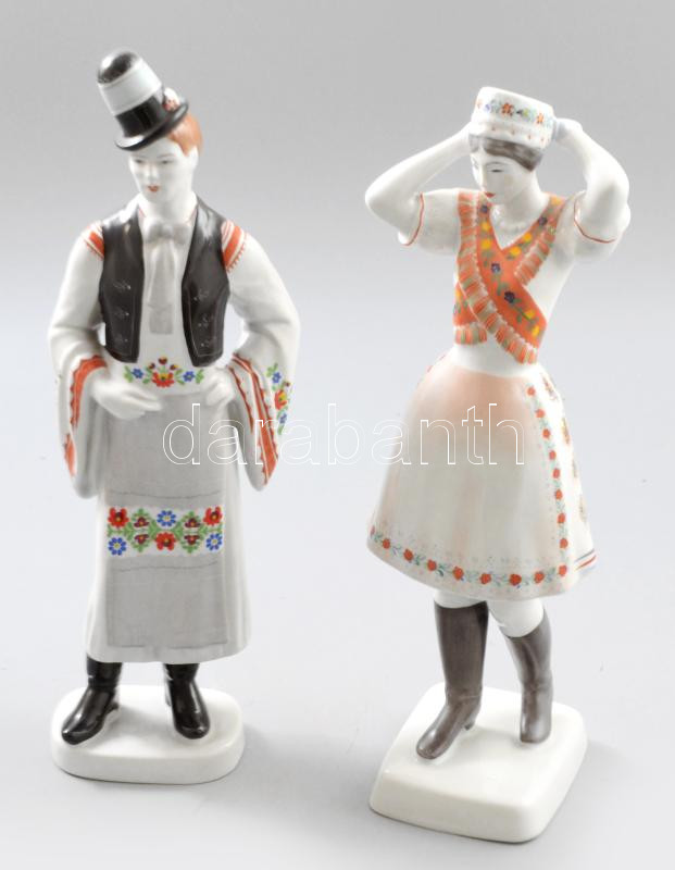 Leírás: Hollóházi népviseletes fiú és lány. Jelzett, hibátlan (alátámasztási nyommal), m: 30-31 cm